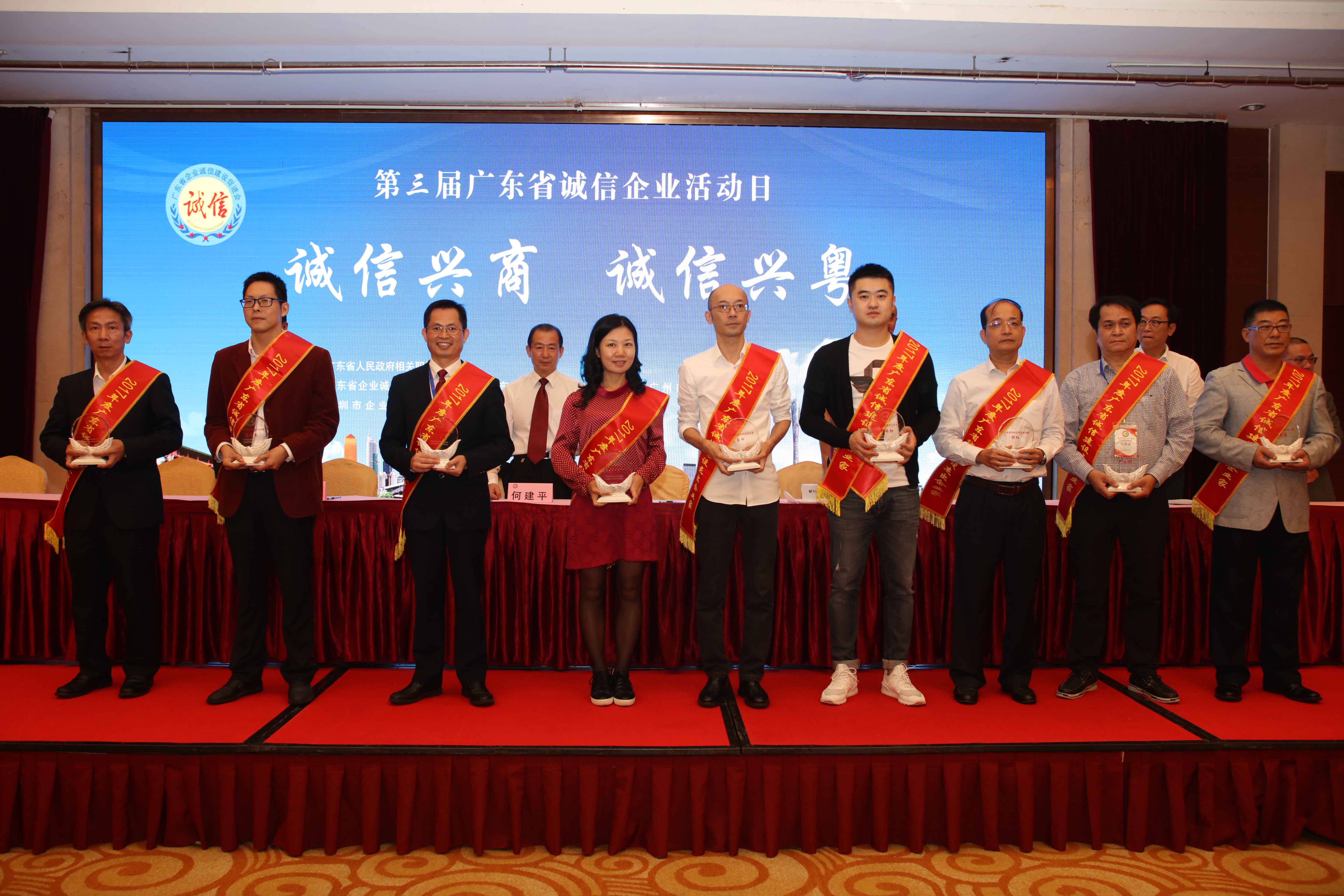 由广东省企业诚信建设促进会、广东省企业竞争力促进会和广州市诚信建设促进会联合主办的2017年度广东省诚信企业表彰仪式于2017年11月13日上午在广州市珠江宾馆内举行。中共广东省委宣传部、省工商局、省国税局等相关部门和全省企业代表及专家学者、新闻媒体近300人参加了会议。